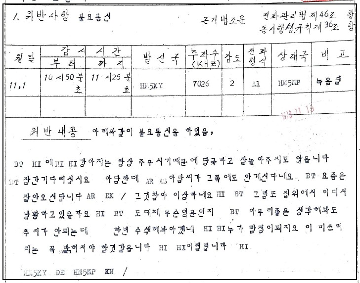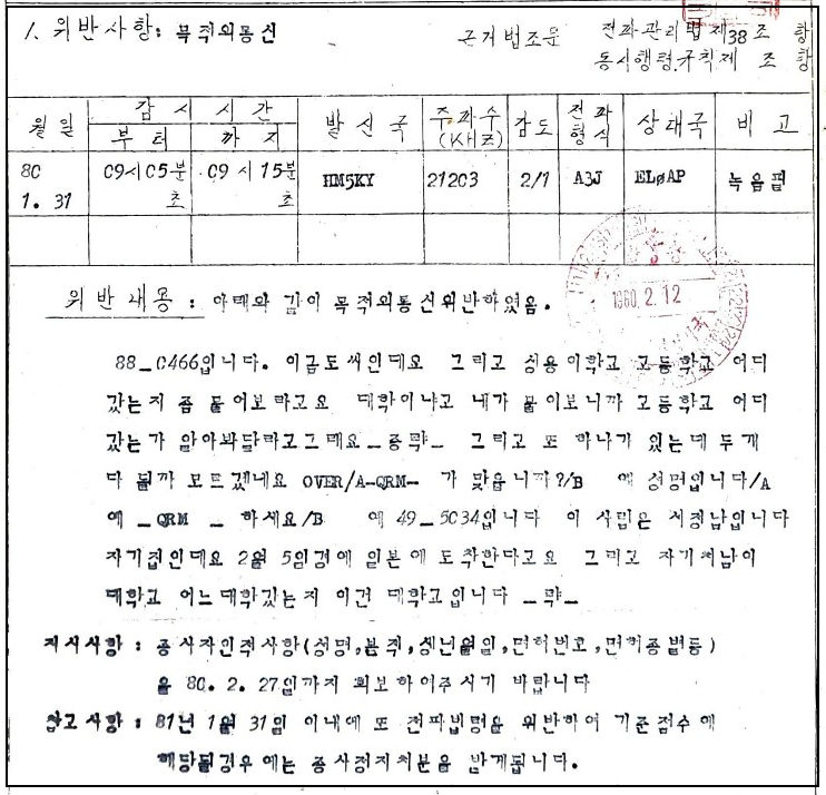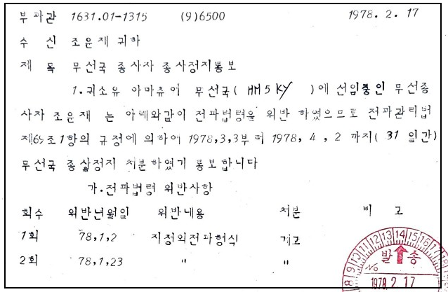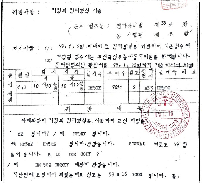 처음 계고장을 받은 이유는 “지정외 전파형식 사용"이었습니다. 1970년대에는 3급 아마추어 무선기사에게 전신만 허가해 주었는데 SSB로 교신한 것이 문제가 되었습니다. 신년컨테스트가 있는 날이었는데 리포트를 교환하는 그 짧은 순간에 딱 걸린겁니다.