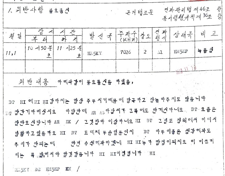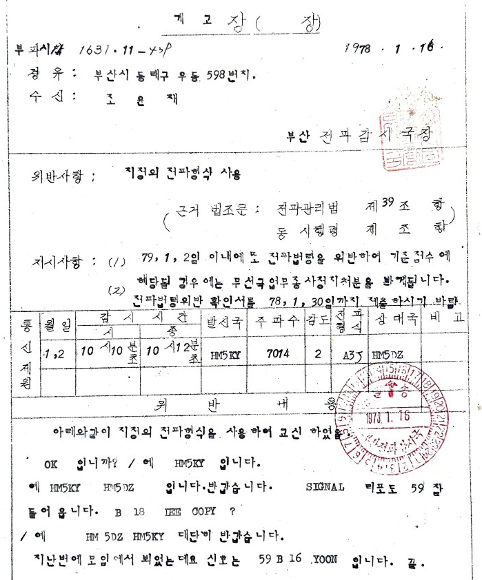 처음 계고장을 받은 이유는 “지정외 전파형식 사용"이었습니다. 1970년대에는 3급 아마추어 무선기사에게 전신만 허가해 주었는데 SSB로 교신한 것이 문제가 되었습니다. 신년컨테스트가 있는 날이었는데 리포트를 교환하는 그 짧은 순간에 딱 걸린겁니다.