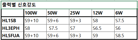 - 100w 출력을 25w로 줄이면(4배) S메타로 한 눈금 낮아진다.